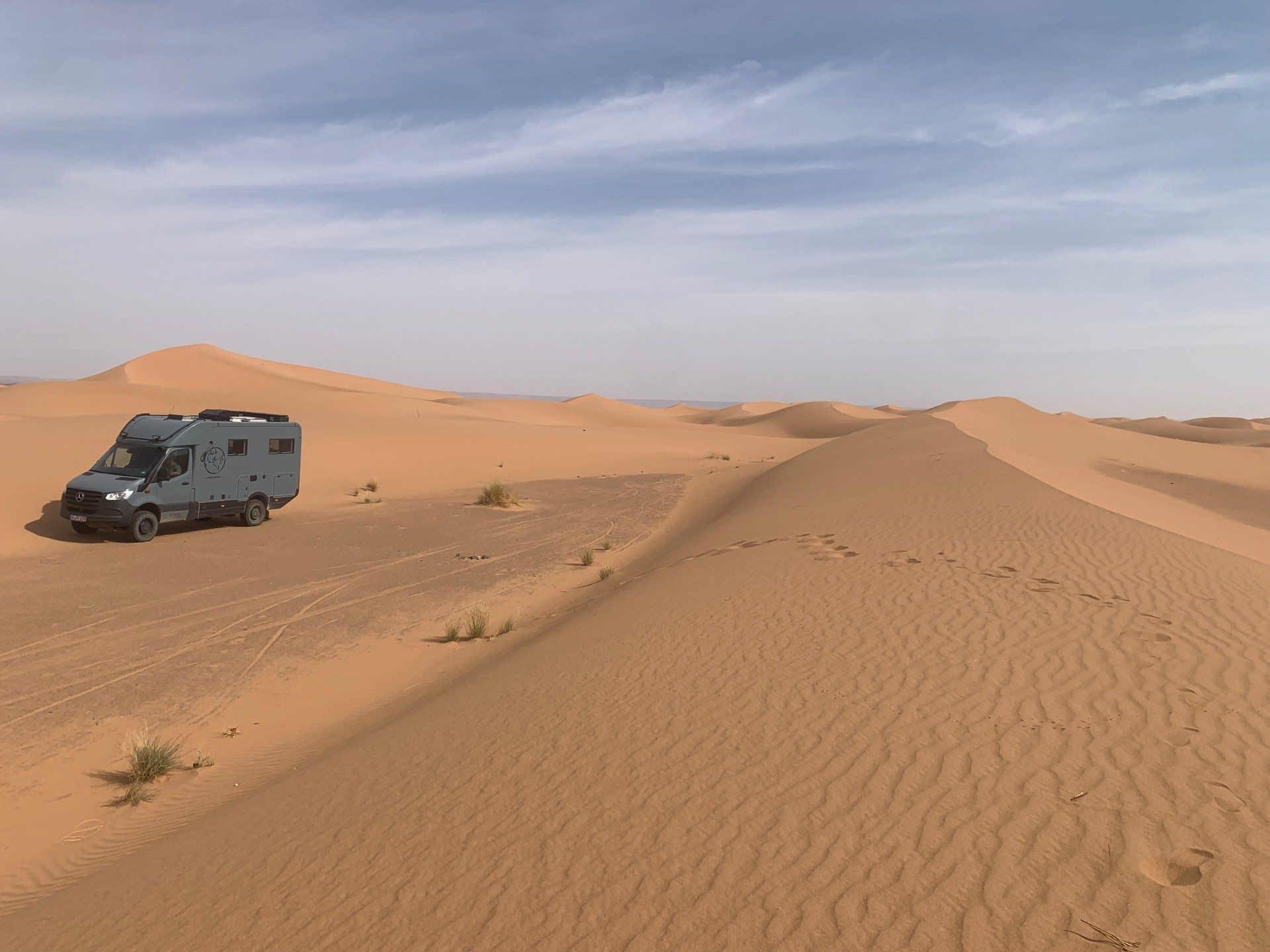 10 Tage durchstreifen wir jetzt die Marokkanische Sahara um zu sehen, was der Autark Runner wirklich kann. Und wir sind echt überrascht. im 4x4-Modus und nur 2 bar in den AT-Reifen pflügt sich das BASECAMP relativ einfach durch die Wüste. Längere Fahrten über Sand, Wellblechpisten und Steinwüsten hat der Sprinter bisher gut überstanden. Klar mussten wir uns schon wieder ausbuddeln. Aber das waren klassische Fahrfehler. Im Tiefsand anhalten gehört nicht zu den besten Ideen! Ansonsten macht die Wüste einen Mordsspass. Die landschaftlichen Eindrücke sind überwältigend. Die unermessliche Weite haut einen um. Die Camps in den Oasen sind echt schön, manche haben sogar einen Pool, keine schlechte Idee bei immer noch 30 Grad im Oktober.